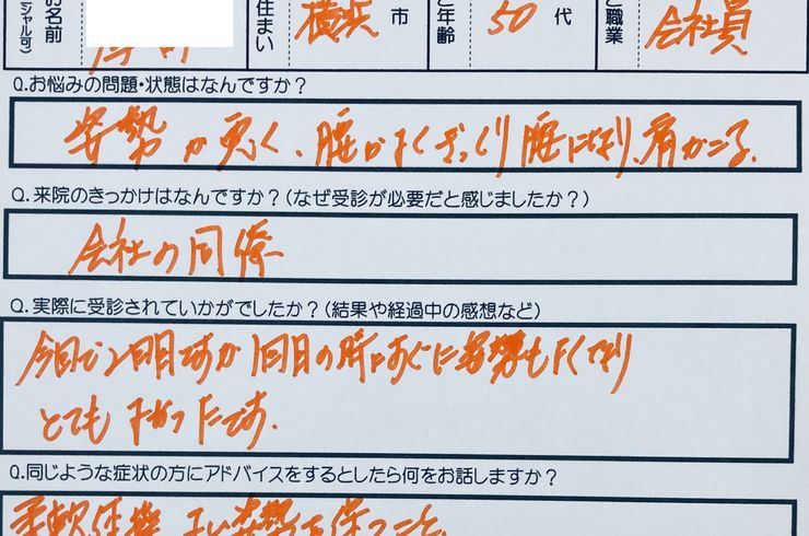 2022/04/22日付:2022年3月 患者データ:50代、女性、会社員、横浜市在住、既往歴:ぎっくり腰、変形性股関節症、変形性膝関節症、アレルギー 疑われる疾患と主訴:筋・筋膜性疼痛、神経伝達異常、肩こり、緊張性頭痛 動機:会社の同僚が痛みと姿勢が良くなるのが目に見えてわかったので聞いた エピソード:痛みやこりが強く、猫背がひどい状態であった NEEDS判定:1回目から体がほぐれ、姿... -