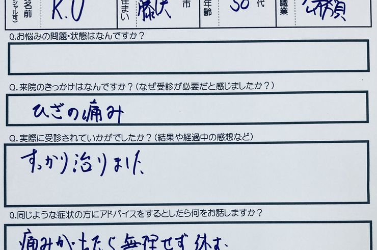 2021/02/16日付:2021年2月 患者データ:藤沢市在住、男性、50代、既往歴:足首の捻挫・鞭打ち 疑われる疾患と主訴:ランナーズニー、鵞足の痛み、ランニングでの膝の痛み、お皿の痛み 動機:膝の痛みがあり、ネットで検索。と回答。 エピソード:足の痛みの為、かばいながら歩いて来院。 NEEDS判定:すっかり良くなりました。と回答。 患者様からのADVICE:痛みが出たら無理せず... -