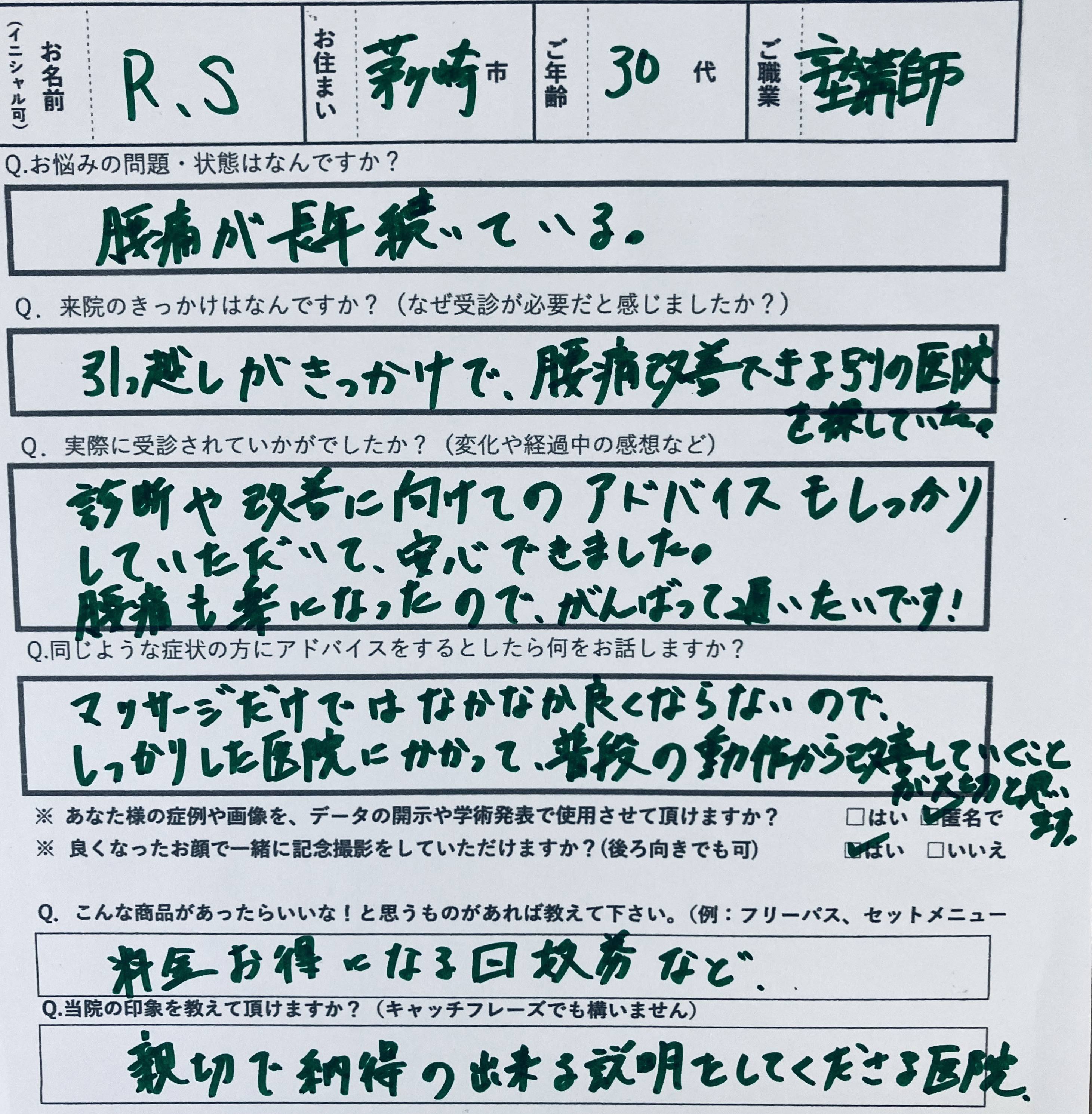 患者様からのADVICE:マッサージだけではなかなかよくならないので、しっかりした院に通院して、普段の動作・姿勢から改善していく方が良い。と回答。