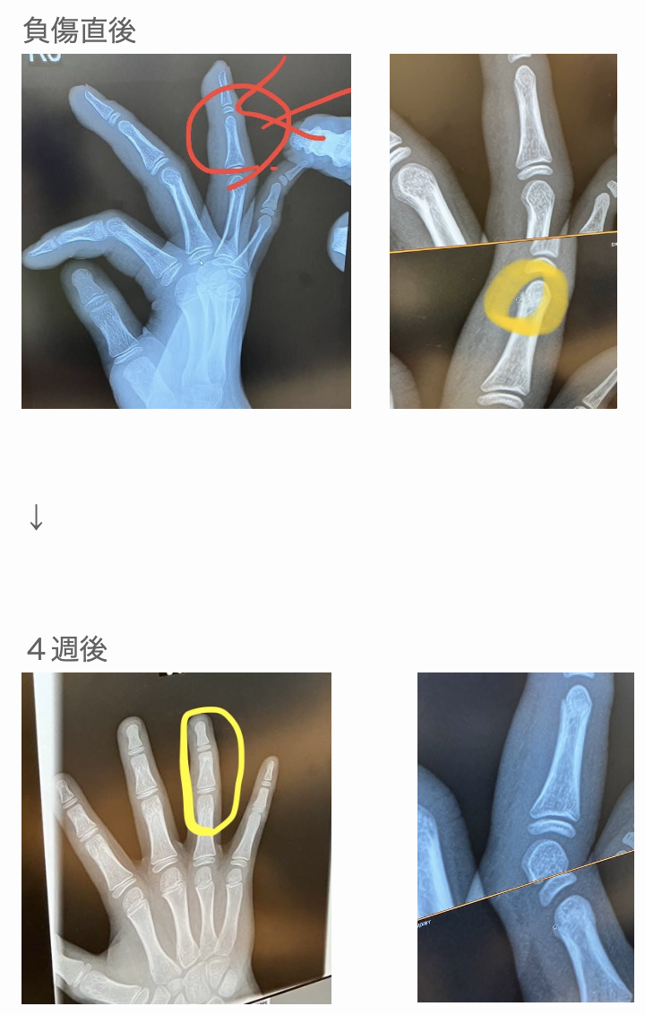 考察:指の損傷は軽視し安いので注意が必要。治癒期間が大幅に伸びてしまう傾向があるのでギプス固定、清拭、超音波治療(リーパス)、エクササイズ、腫れの除去が必須になってくる。
