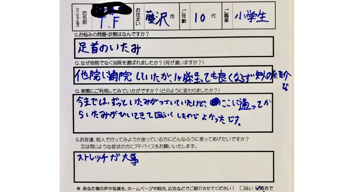 茅ヶ崎市のチガサキ整骨院 【長引く足首の捻挫の痛みのスポーツ整体の症例】 NO35