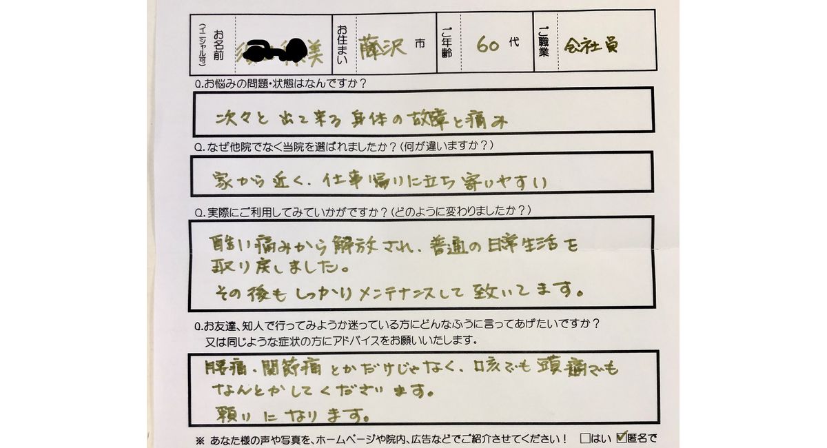 患者様からのADVICE:ギックリ腰・関節痛だけでなく咳でも頭痛でもなんとかしてくれるので頼りにしています。とのこと。