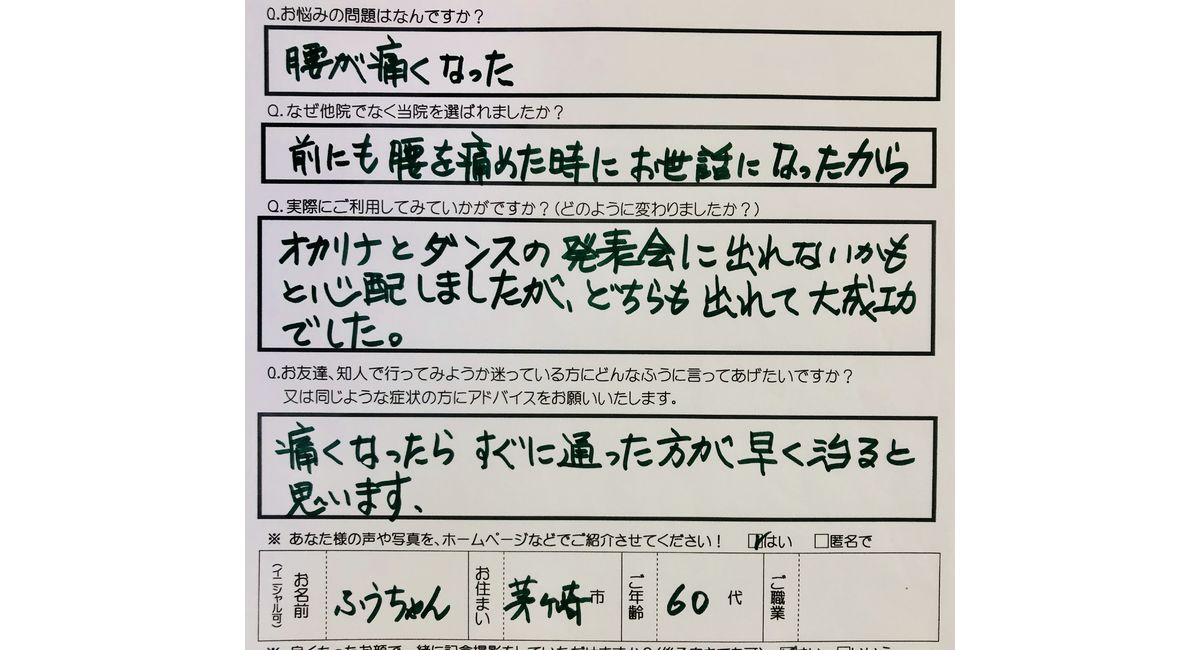 動機:疼痛が強くダンスのパーティーに出場できない、以前にもみてもらった