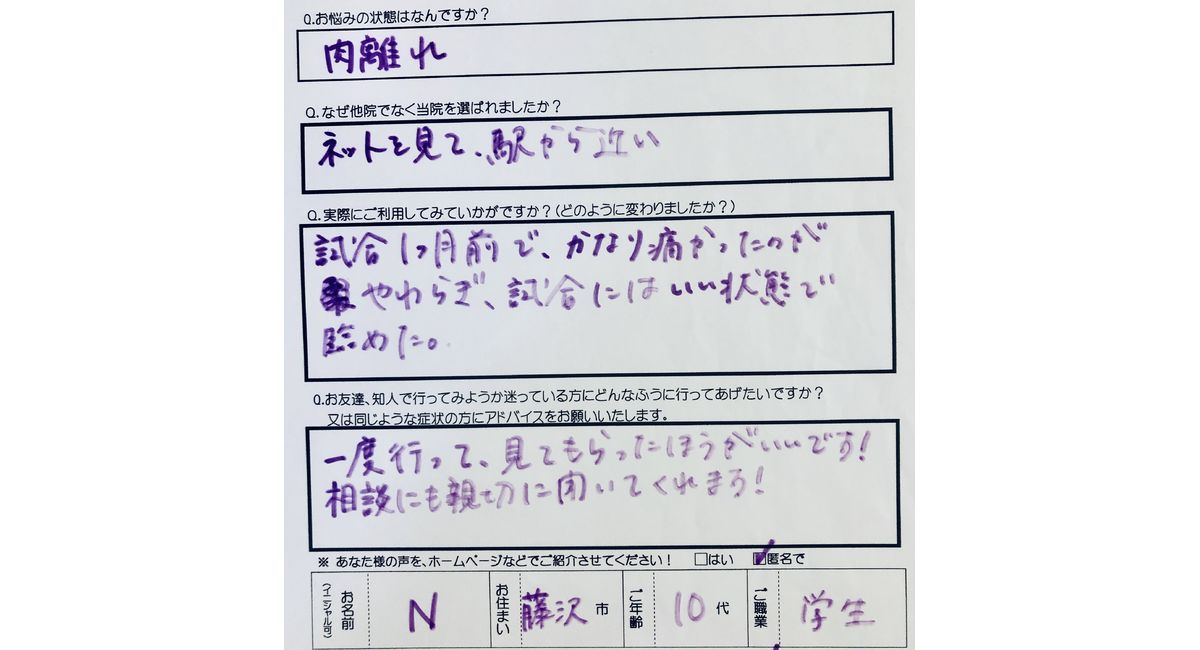 治療内容:肉離れのスポーツ整体、MCR、栄養指導、成達指導、テーピング