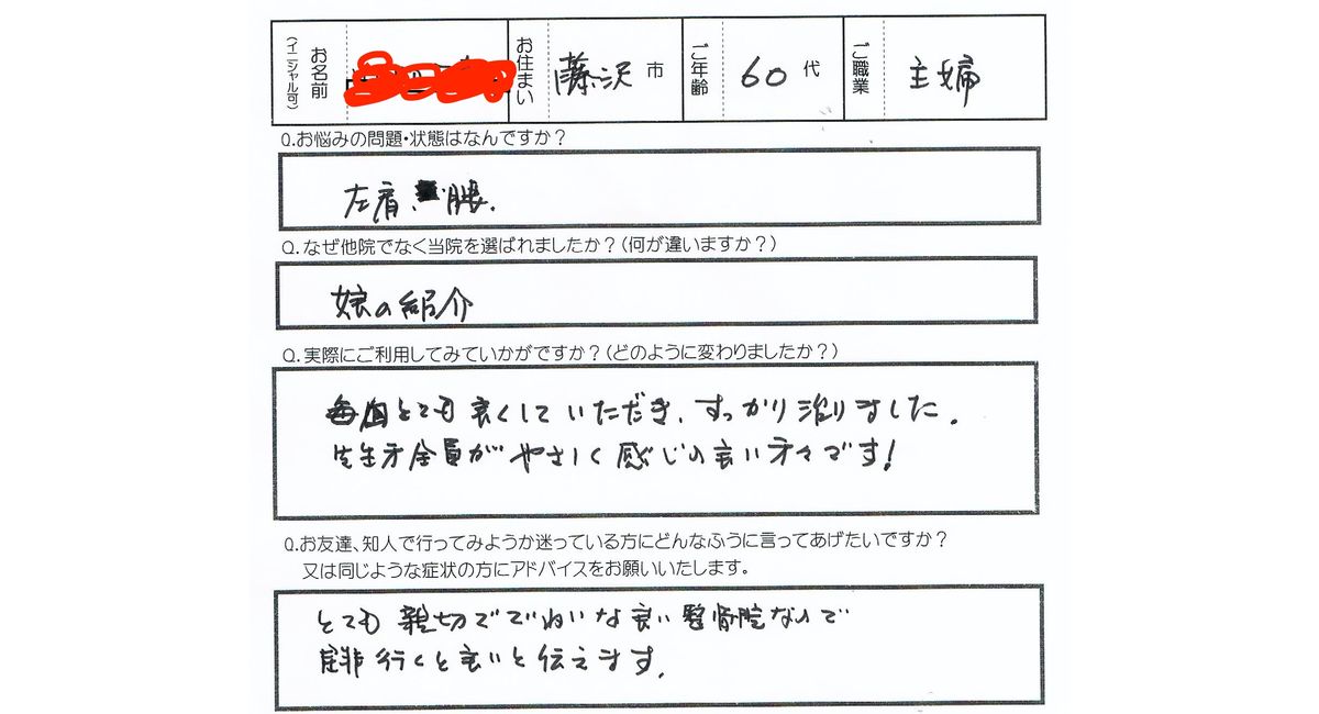 患者データ:藤沢市在住、女性、主婦、60代、既往歴:ギックリ腰・坐骨神経の痛み・足のしびれ