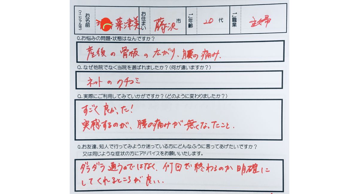 患者データ:藤沢市在住、女性、主婦、20代、既往歴:ギックリ腰・坐骨神経の痛み・寝違え・肩こり