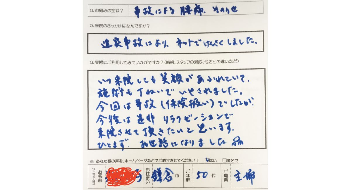 動機:追突事故で怪我をして、インターネットで検索し来院。と回答。