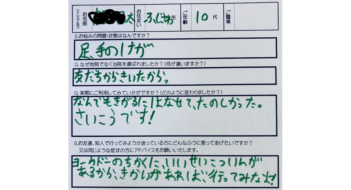 患者様からのADVICE:ヨーカドーの近くにいい接骨院があるよ。と回答。