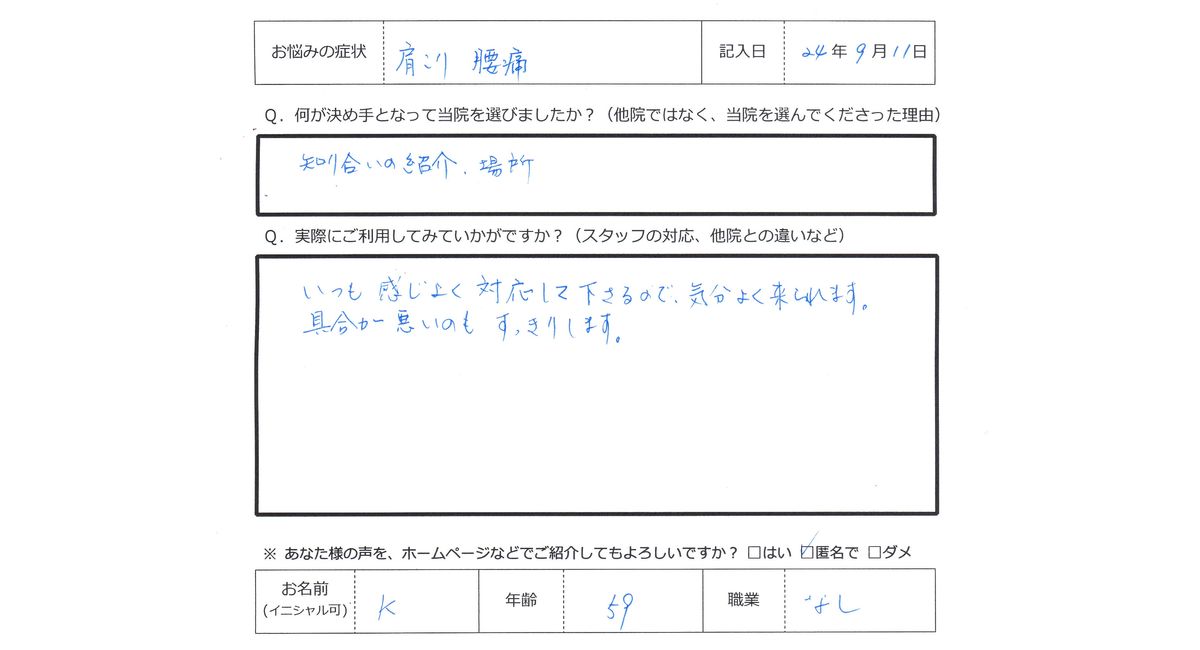 患者データ:藤沢市在住、女性、50代、主婦、既往歴:肩こり・腰の痛み・坐骨神経の痛み・頭痛