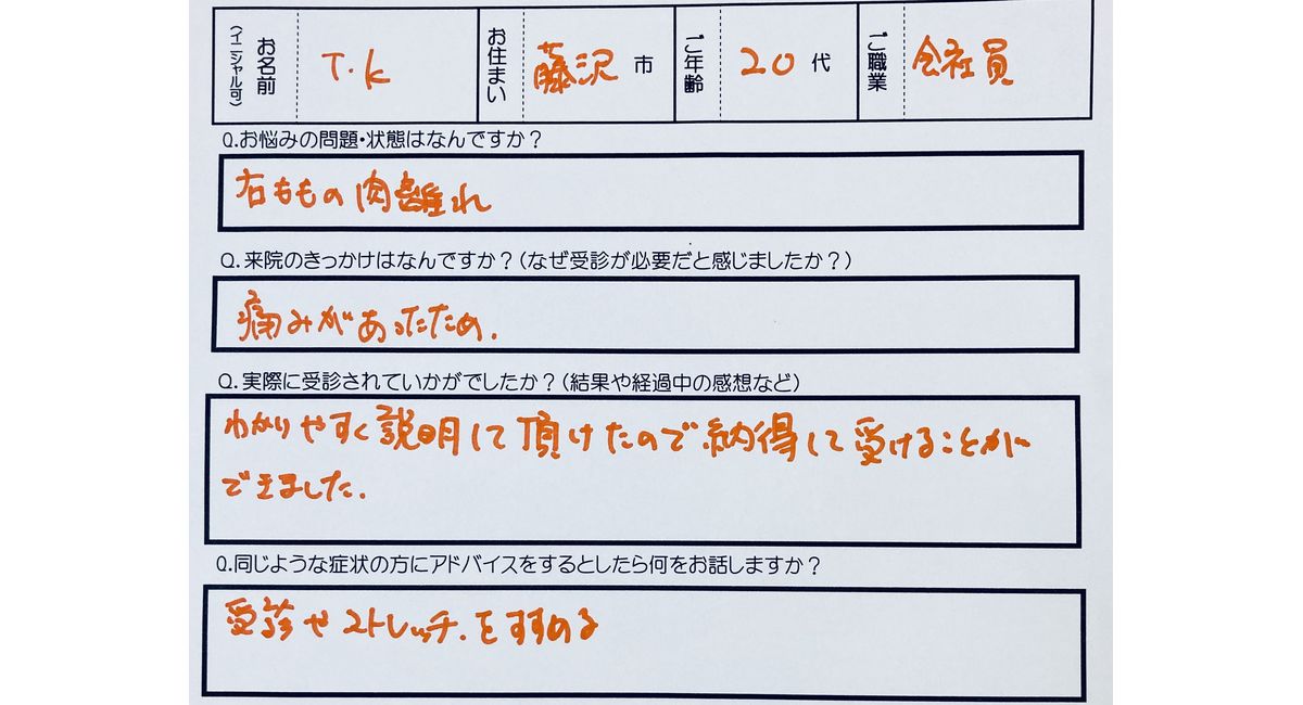 患者データ:藤沢市在住、20代、女性、会社員、既往歴:ギックリ腰・ムチウチ