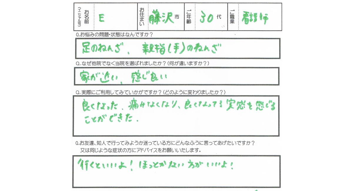 患者データ:藤沢市在住、女性、30代、看護師、既往歴:むち打ち・寝違え・肩こり