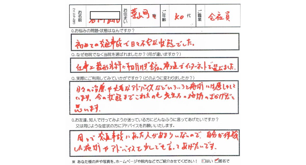 茅ヶ崎市のチガサキ整骨院【交通事故後の怪我・むち打ちの症例】 No152