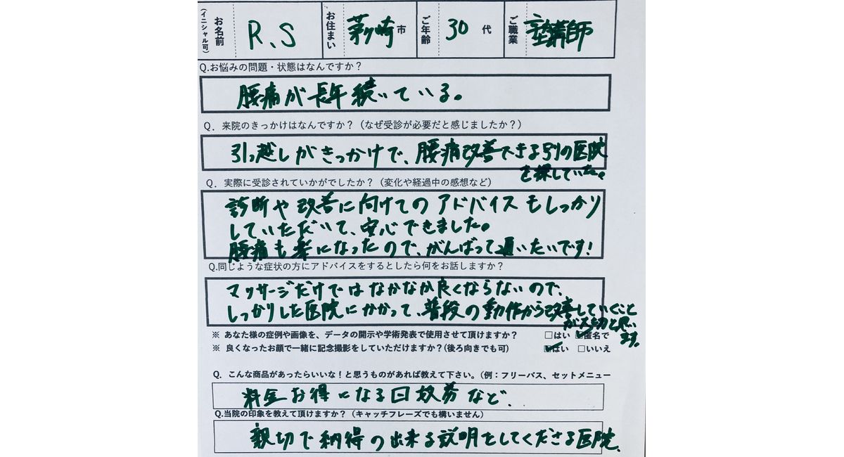 動機:引越しがきっかけで腰痛になり、改善できる整骨院を茅ヶ崎市内で探していた。