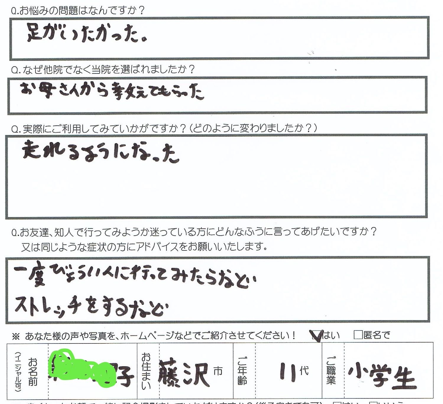 患者様からのADVICE:私のように我慢せず、通って痛みを解消し快適な生活を送った方がいいですよ。と回答。